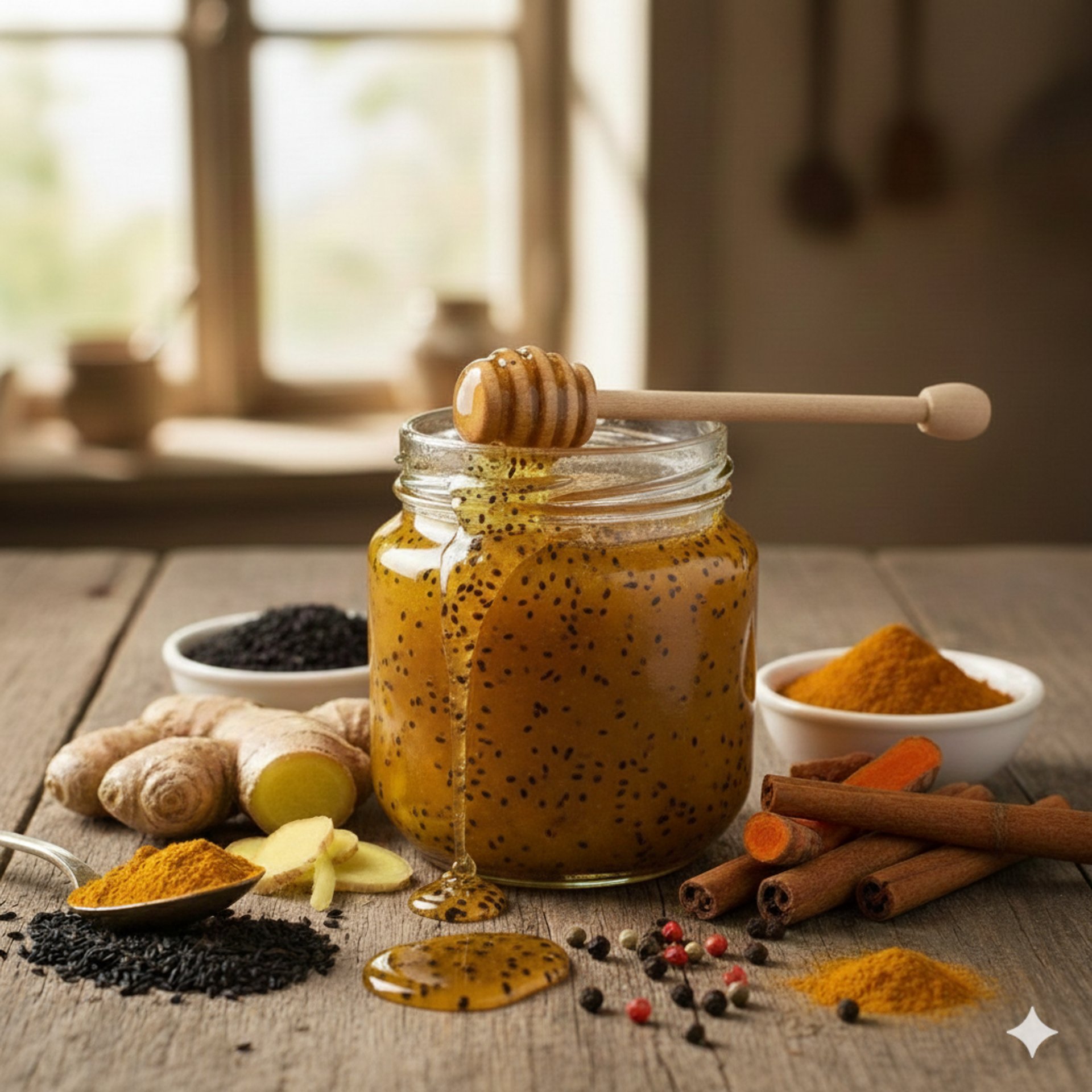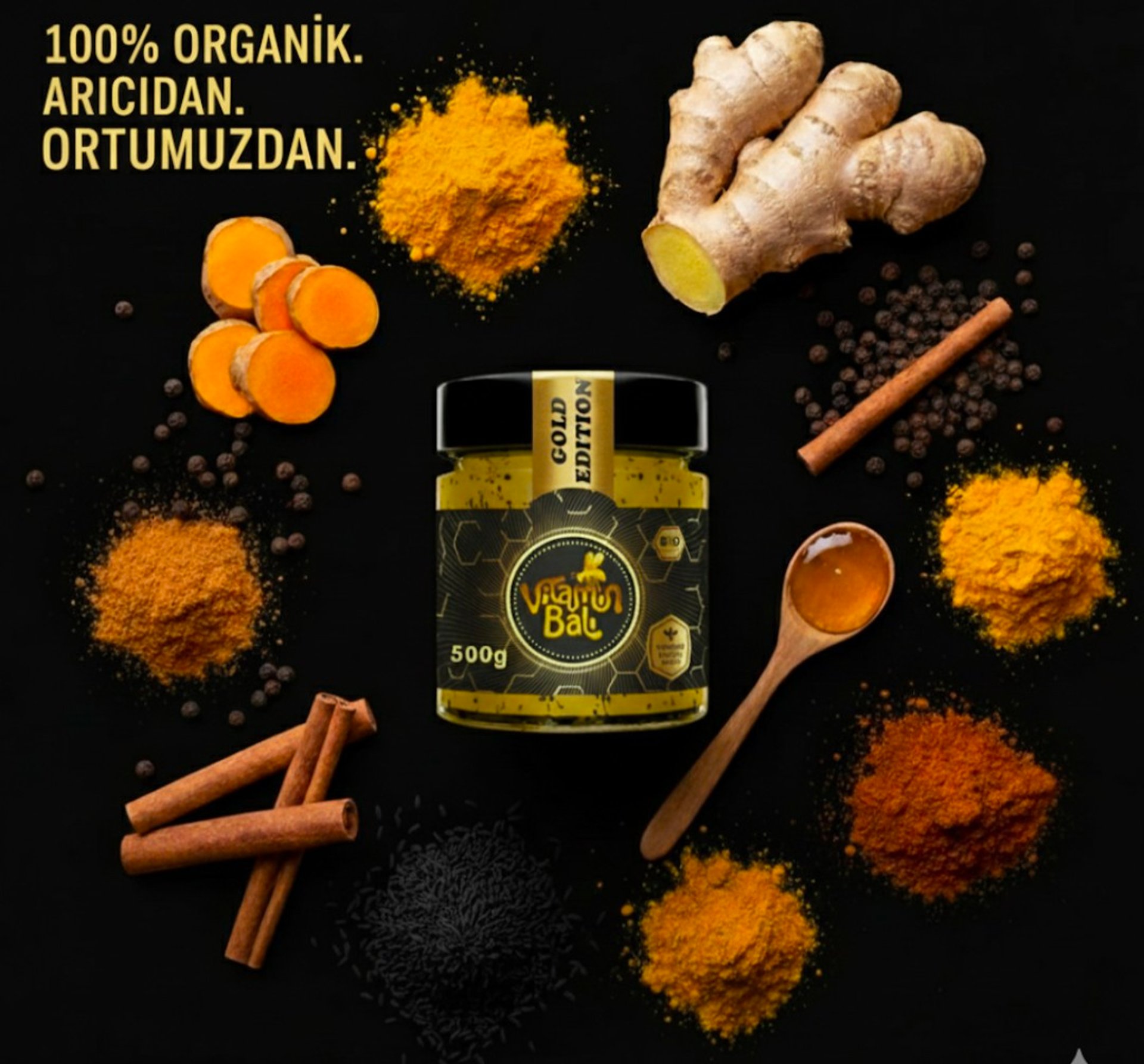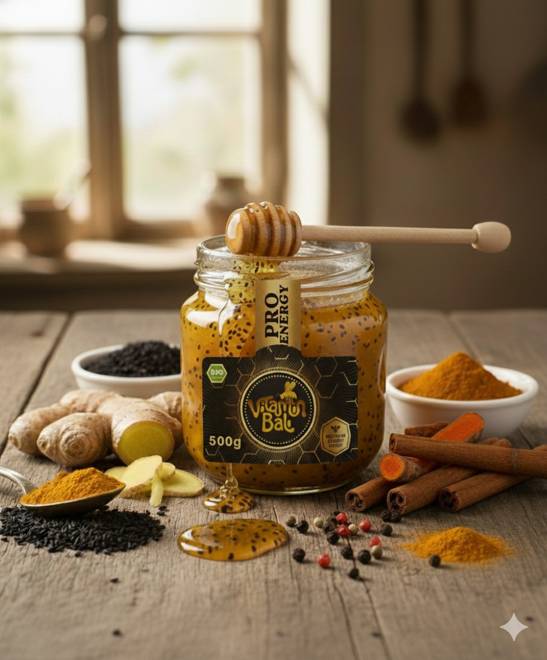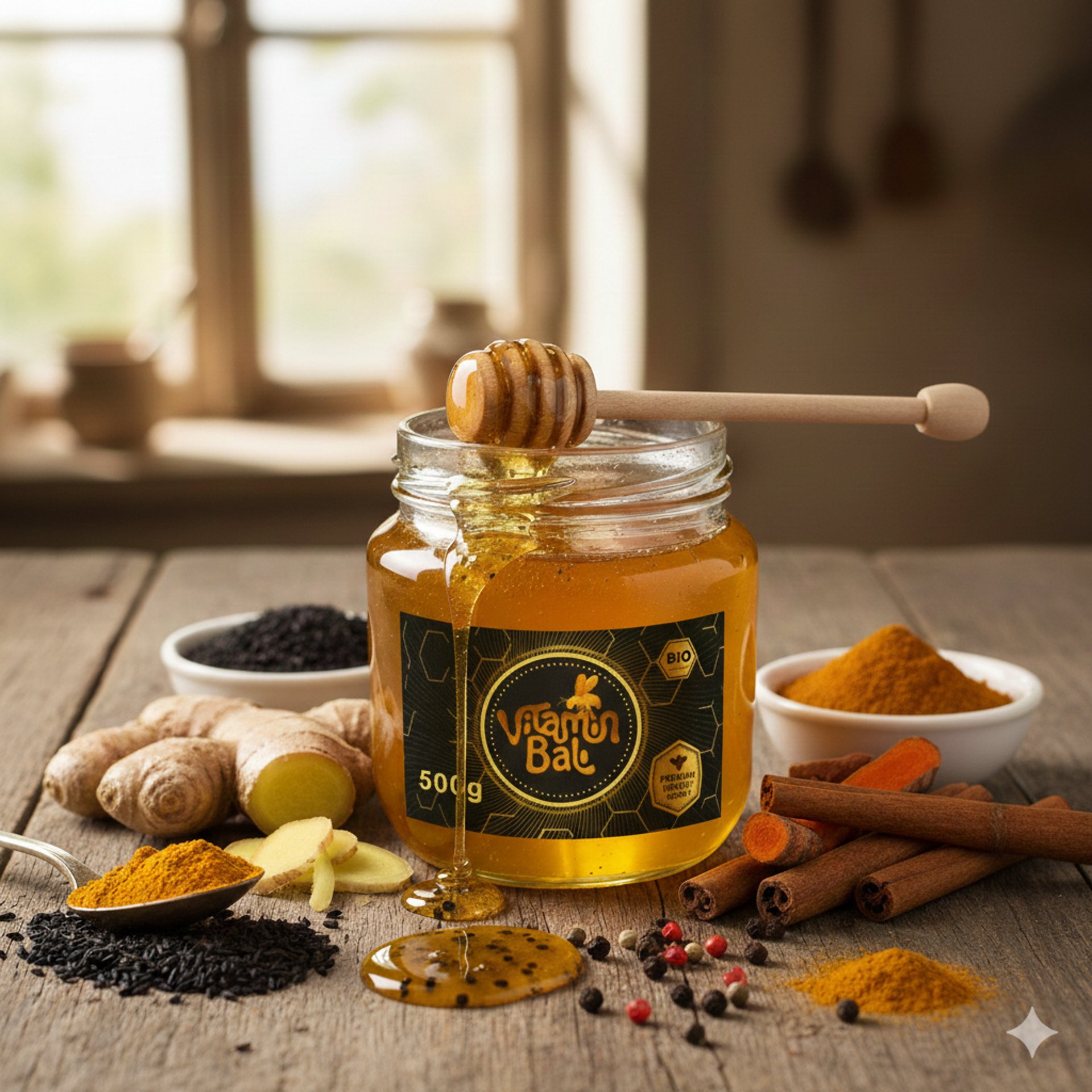 Bu yüksek kaliteli bal karışımı, ince kıvamlı organik balı; öğütülmüş organik çörek otu, organik zencefil, organik zerdeçal, organik tarçın ve organik karabiber ile birleştirir. Tüm içerikler, kontrollü organik tarımdan elde edilmiştir ve bilinçli beslenmeye katkı sağlar.