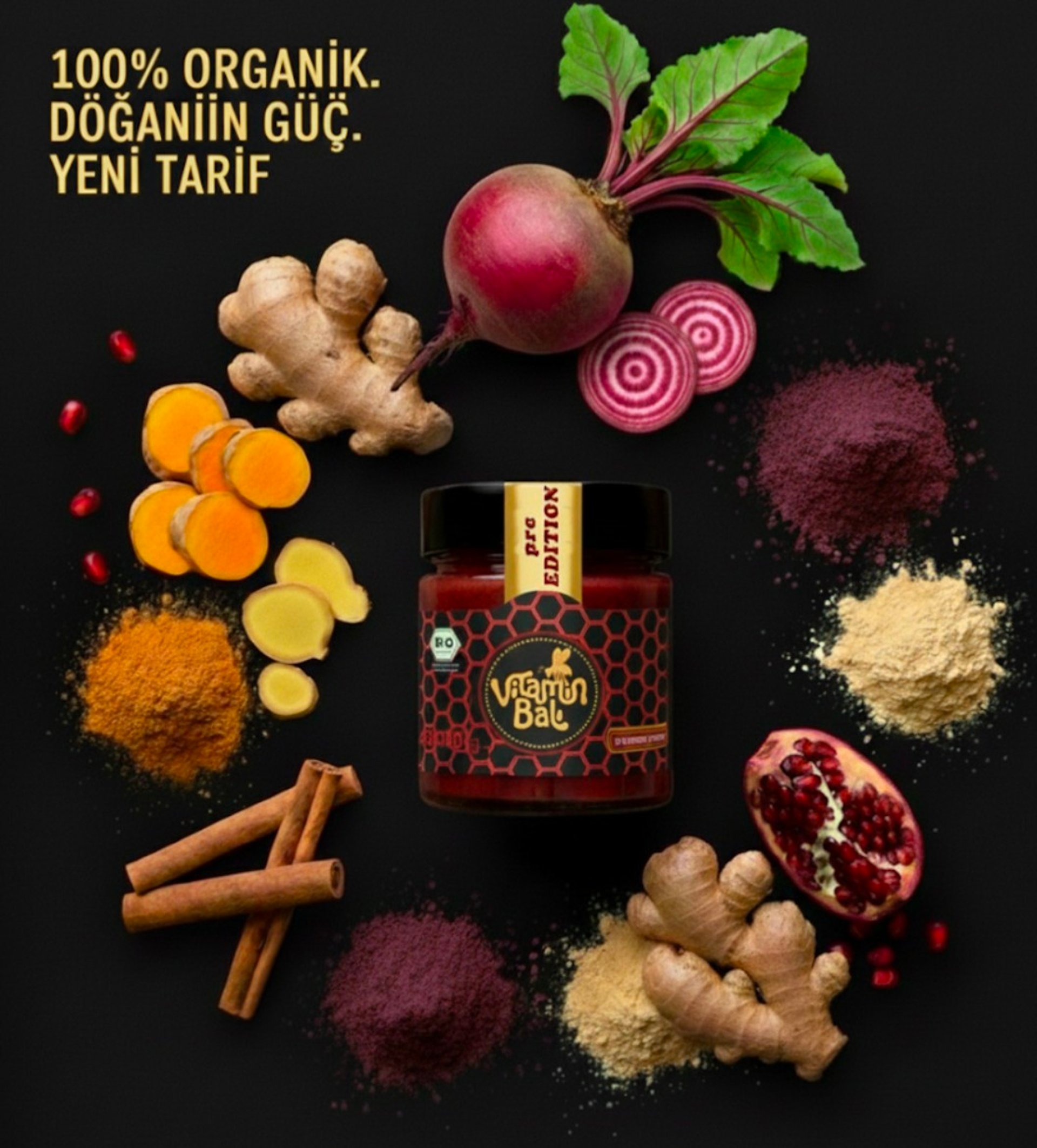 Organik pancar, organik acai, organik çemen otu, organik zencefil, organik maca, organik nar (%9,2) (TR/TR dışı içerikler)